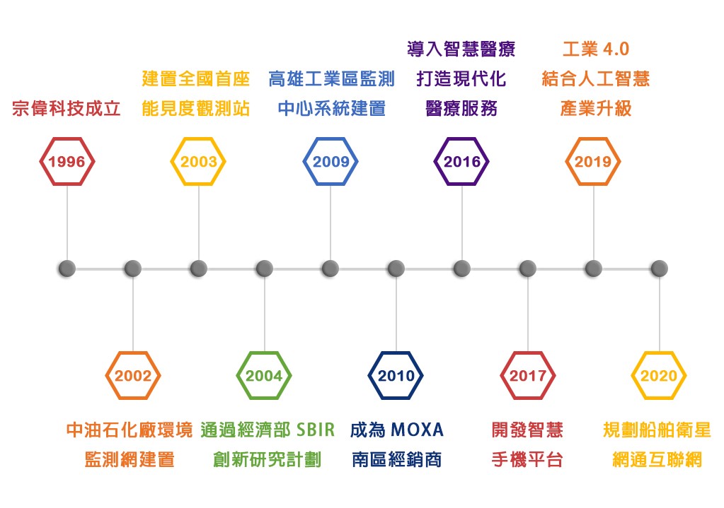 宗偉科技成立於1996年,初始經營聯網通訊、軟體設計開發、儀表資料收集及系統整合等各項服務。依照客戶需求且持續運用穩定與創新技術,提供各產業量身打造的客製化解決方案是宗偉不變的初衷,2010年起經銷MOXA工業網通產品並致力於自動化整合系統開發、提供原廠認證的產品技術服務,在軟硬體、網路通訊、工廠、醫院、及政府單位等方面已累積豐富的工業物聯網與資料收集、智能系統整合之相關經驗及專業能力;再於2020年與隴華電子合作進入衛星寬頻網通互聯網領域,逐步打造海陸空融合的物聯網新境界。重視客戶需求、打造核心團隊,一直是宗偉帶給客戶的優質服務,並期望未來於人工智慧(AI)和物聯網(IoT)結合領域能夠創造出更多的智慧聯網(AIoT)科技發展價值,協助產業升級並持續為社會服務。